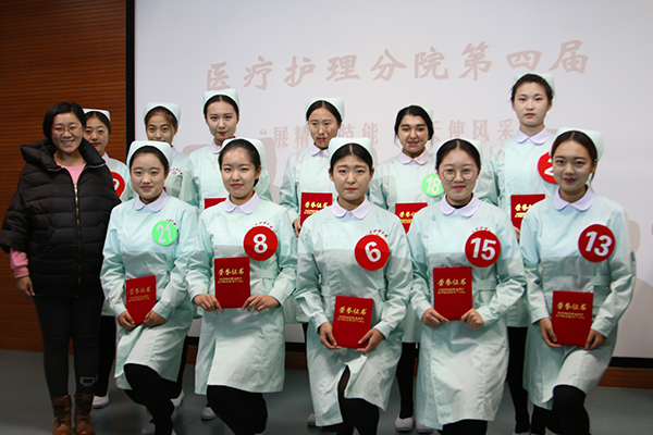 为提高学生护理技术技能,优化护理专业学生的整体形象,11月30日,医疗护理分院第四届“展精湛技能,秀天使风采”护士礼仪技能大赛决赛在博爱楼拉开了帷幕。此次比赛邀请到医护分院副院长姚文山,辅导员田茂莉,专任教师齐琪,韩丽松,姚月荣,唐杨等担任评委。